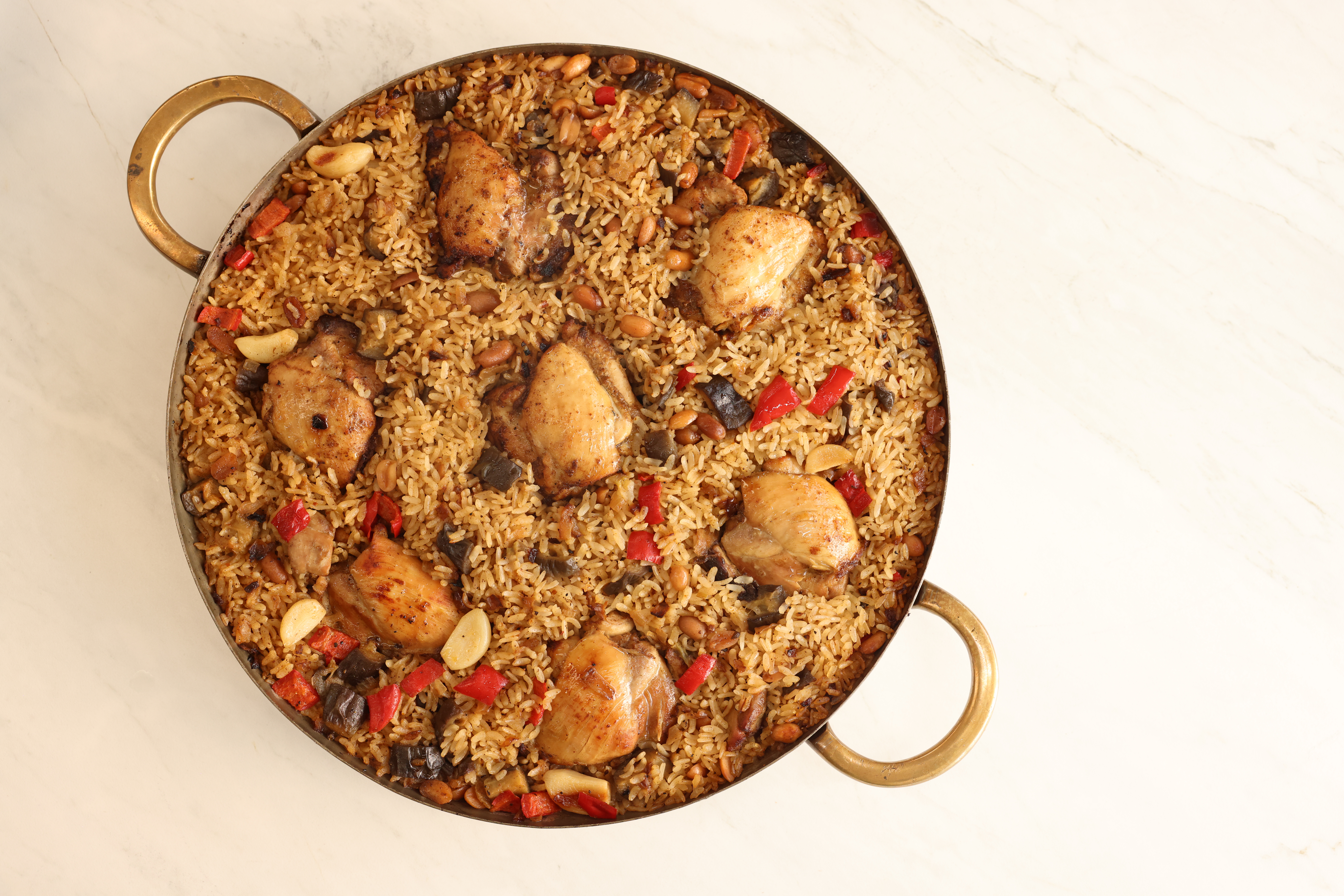 • Pirinçleri de kavurup kenardaki tavukları üzerine dizin.