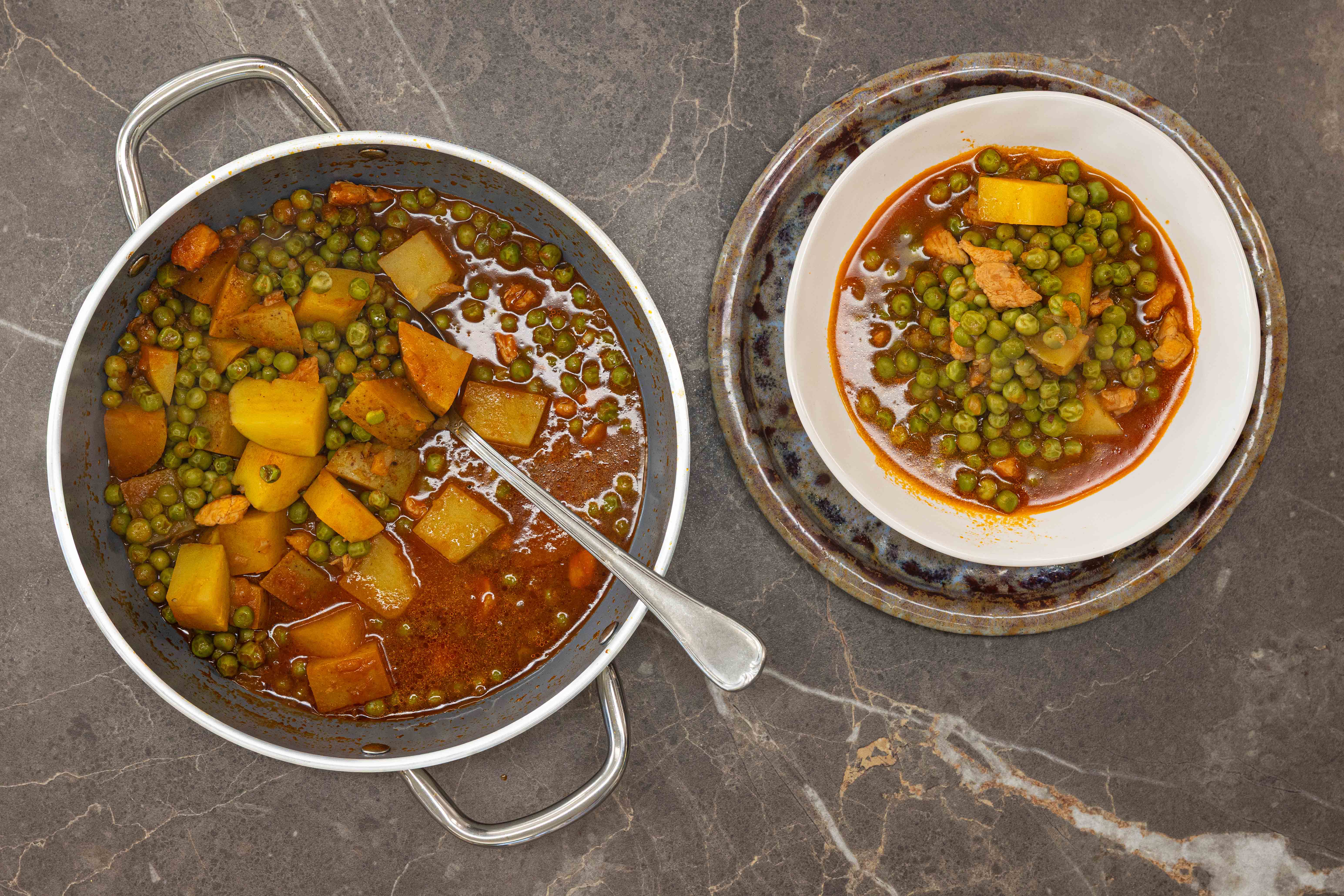 • Dilediğiniz sebze veya bakliyatla istediğiniz yemeği yapabilirsiniz. Örnek olması adına,4-6 kişilik yemek için 3 parça donmuş yemek bazını tencereye ekleyin. Açılınca üzerine iri doğradığınız 1 patatesi, 400 g bezelyeyi ekleyip 1-2 tur kavurun. Üzerine yarım litre su, 1 çay kaşığı kimyon ve birer tutam tuz ve karabiber ekleyip pişirmeye bırakın. Siz