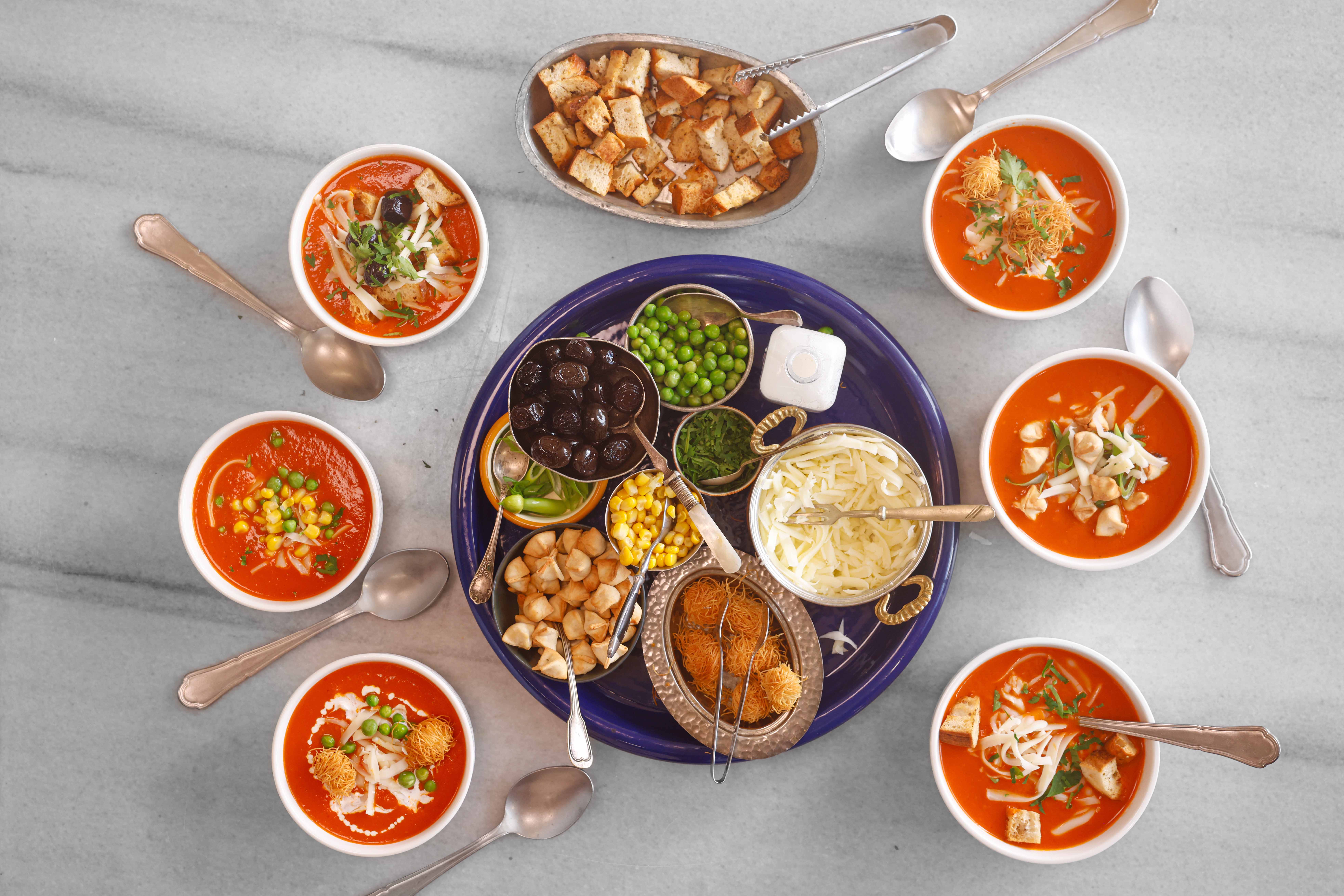 • Çorbanın üzerine ekleyebileceğiniz, kaşar peynir, haşlanmış mısır ve bezelye, siyah zeytin, krema, taze soğan, maydanozu küçük kaselere koyun. Güzelce renk alan kıtır ramazan pidesi, mantı ve kadayıf toplarını da kaselere koyun. Çorbayla birlikte sofraya getirin ve misafirlerin kendi çorbalarını dilediği gibi lezzetlendirdiği bir şenliğe çevirin.