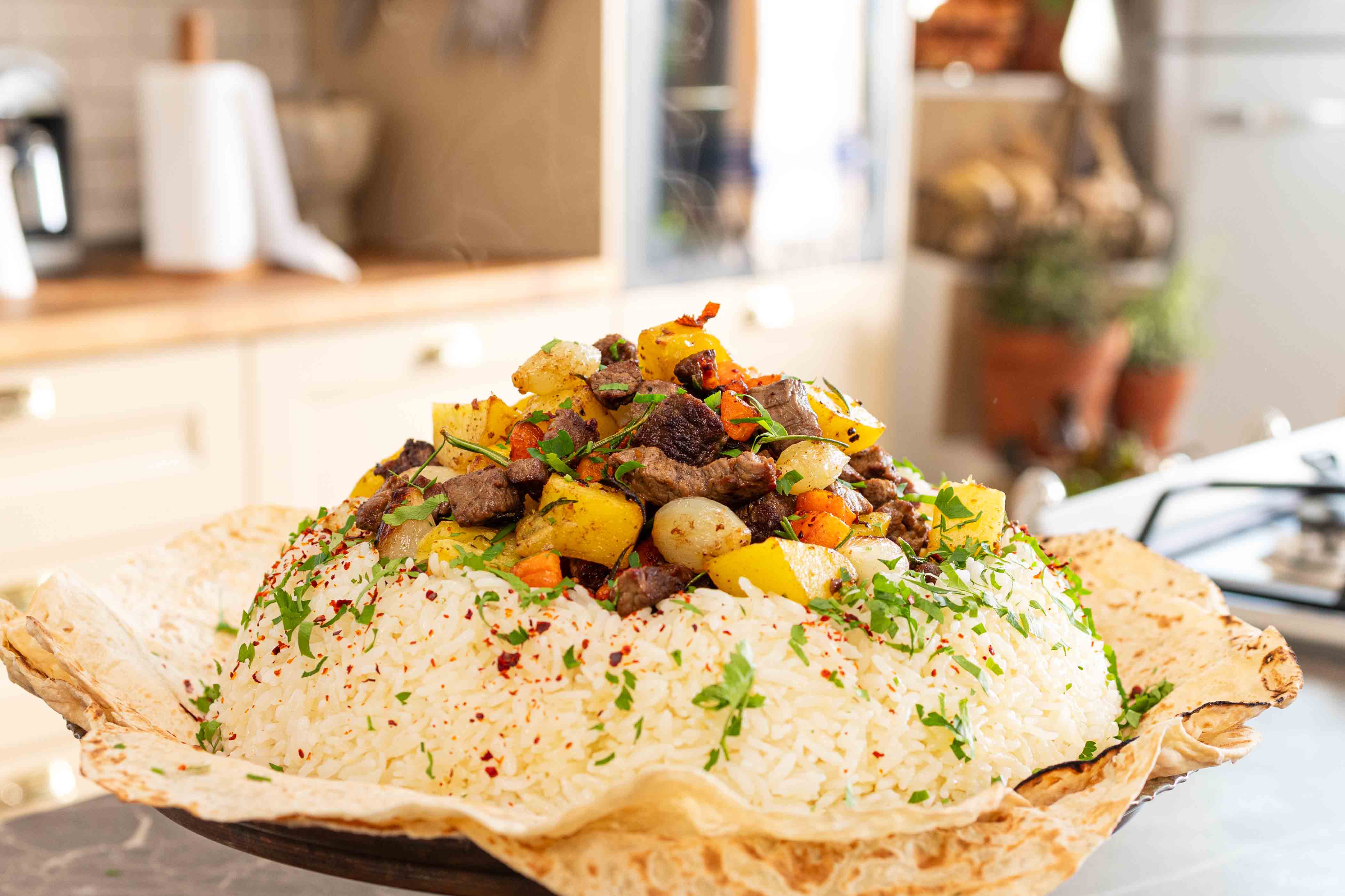 • Ortasındaki kâseyi parmaklarınızı içine sokup dik bir şekilde yukarı doğru çıkartın. Kavrulmuş et ve sebzeleri pilavın ortasındaki boşluğa yerleştirin. Üzerine biraz maydanoz ve pul biber serpince kallavi kuşbaşı et ve pilav altında lavaşıyla emrinize amade!