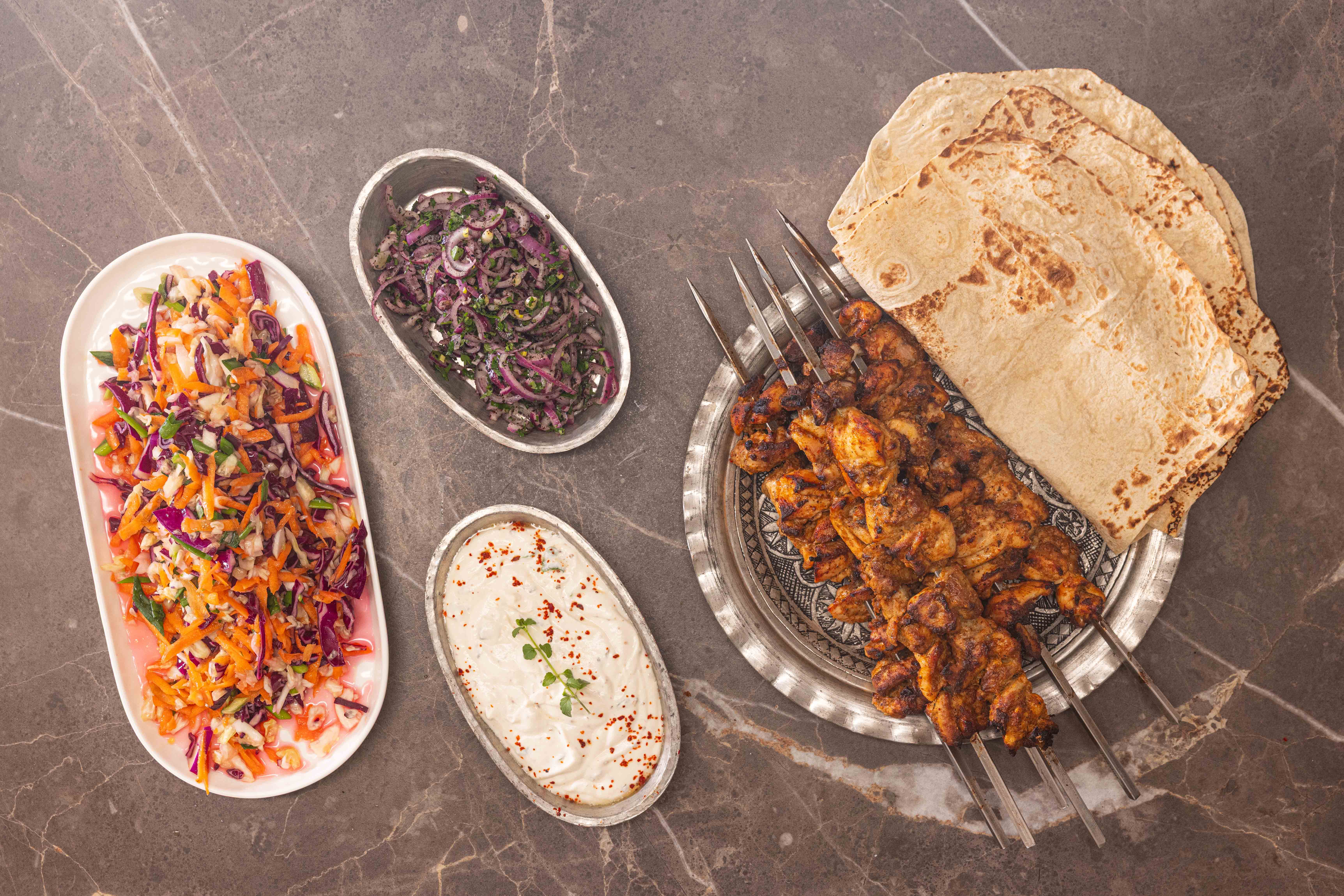 • Nar gibi kızarmış tavukları fırından alın ve lavaşların üzerine dizin. Sumaklı soğan, tahinli yoğurt ve salatası ile sofralarda yerlerini almaya hazır ve nazır.