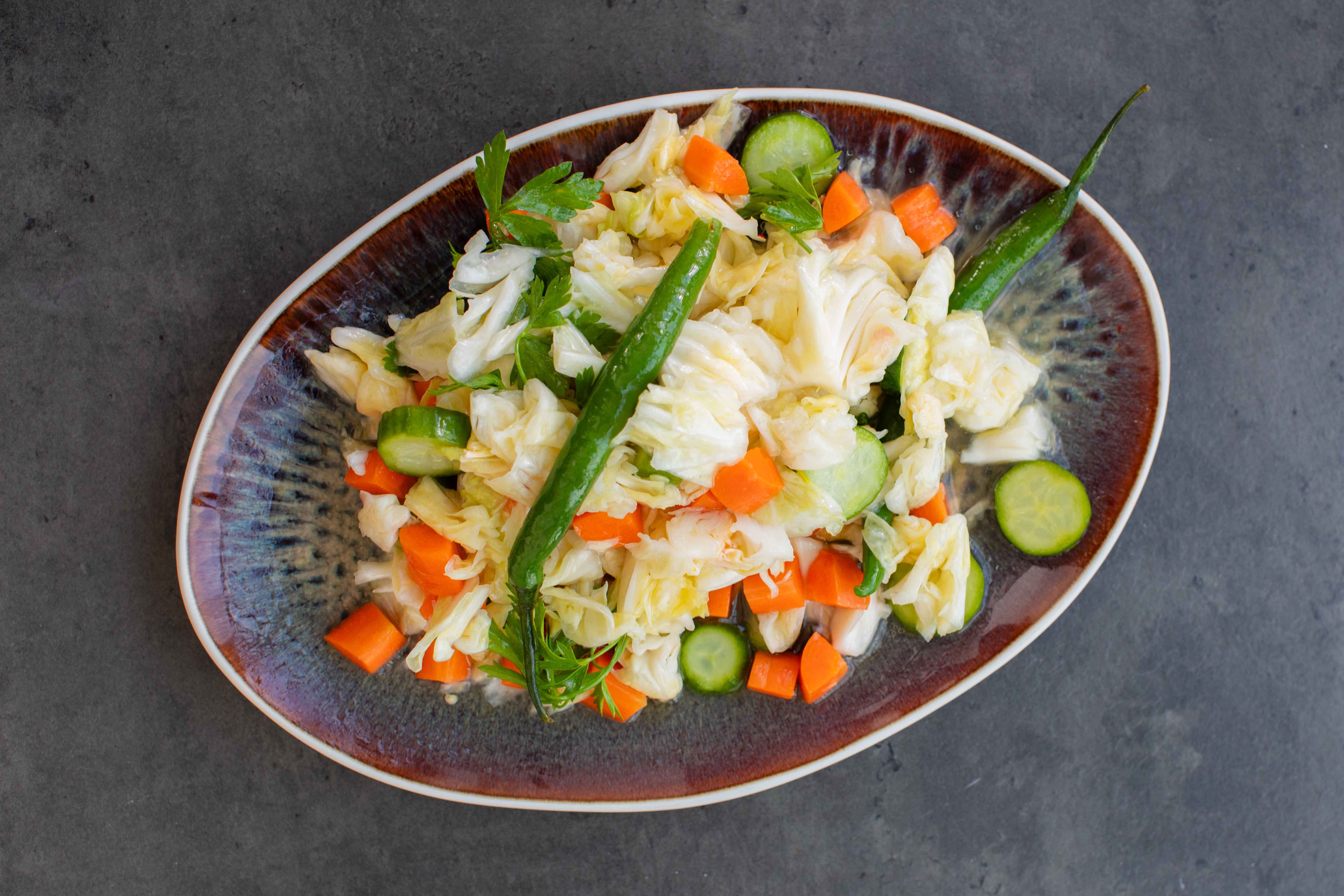 • Geniş bir kâseye bir avuç lahana, bir avuç havuç, bir avuç salatalık,1-2 tane biber ve 2-3 dilim sarımsağı ekleyin. Tüm sebzeler bitene kadar kat kat bu işlemi yapın. Kâsenin en üstüne 4-5 dal maydanozun yapraklarını koyun.