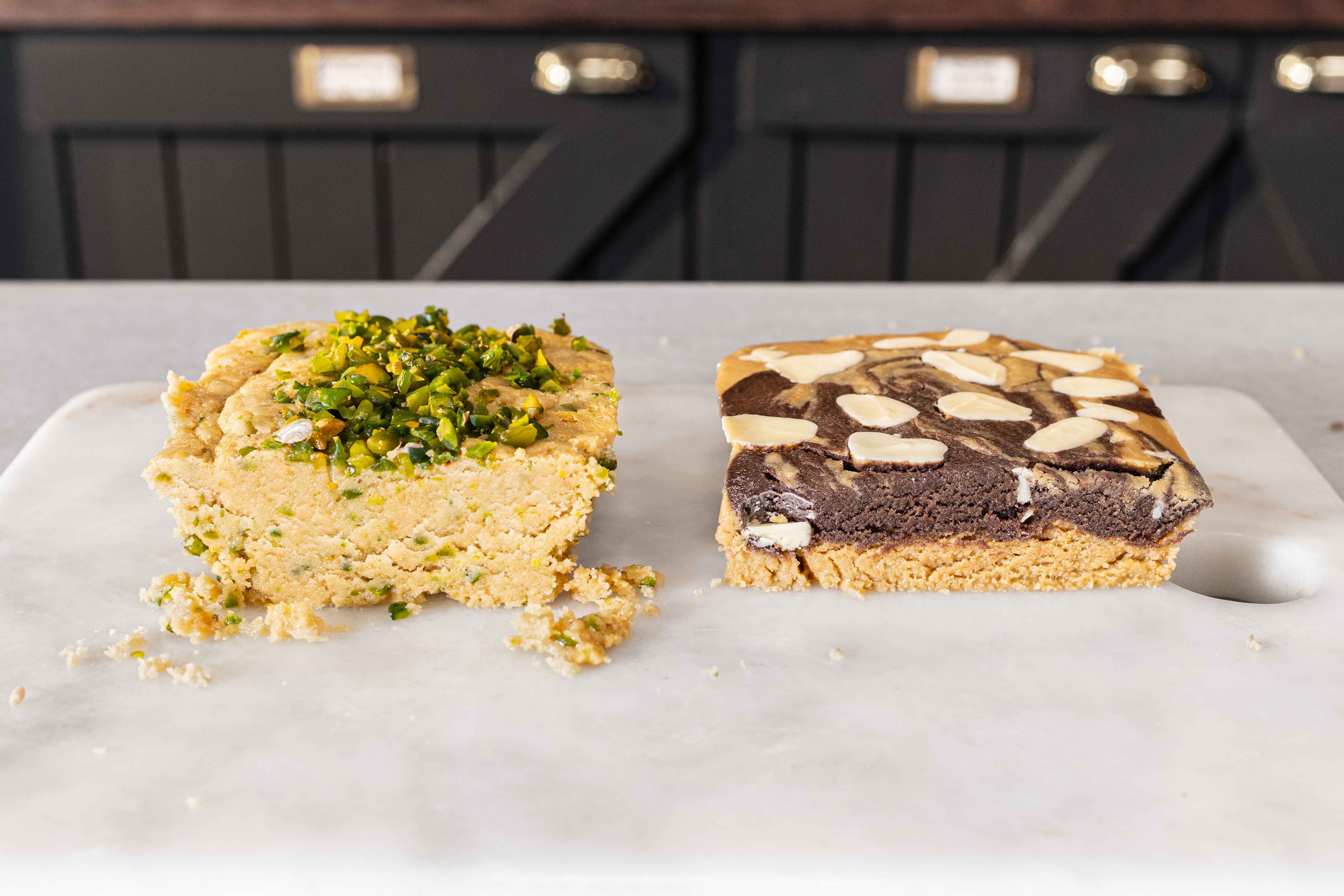 • Pişirme kâğıdı serili kâseye helva karışımının 2/3’ünü ekleyin. Kalan karışıma 1 tatlı kaşığı kakao ekleyin ve çırpmaya devam edin. Bu aşamada çok sertleşirse bardakta kalan tahini ekleyip çırpmaya devam edebilirsiniz.