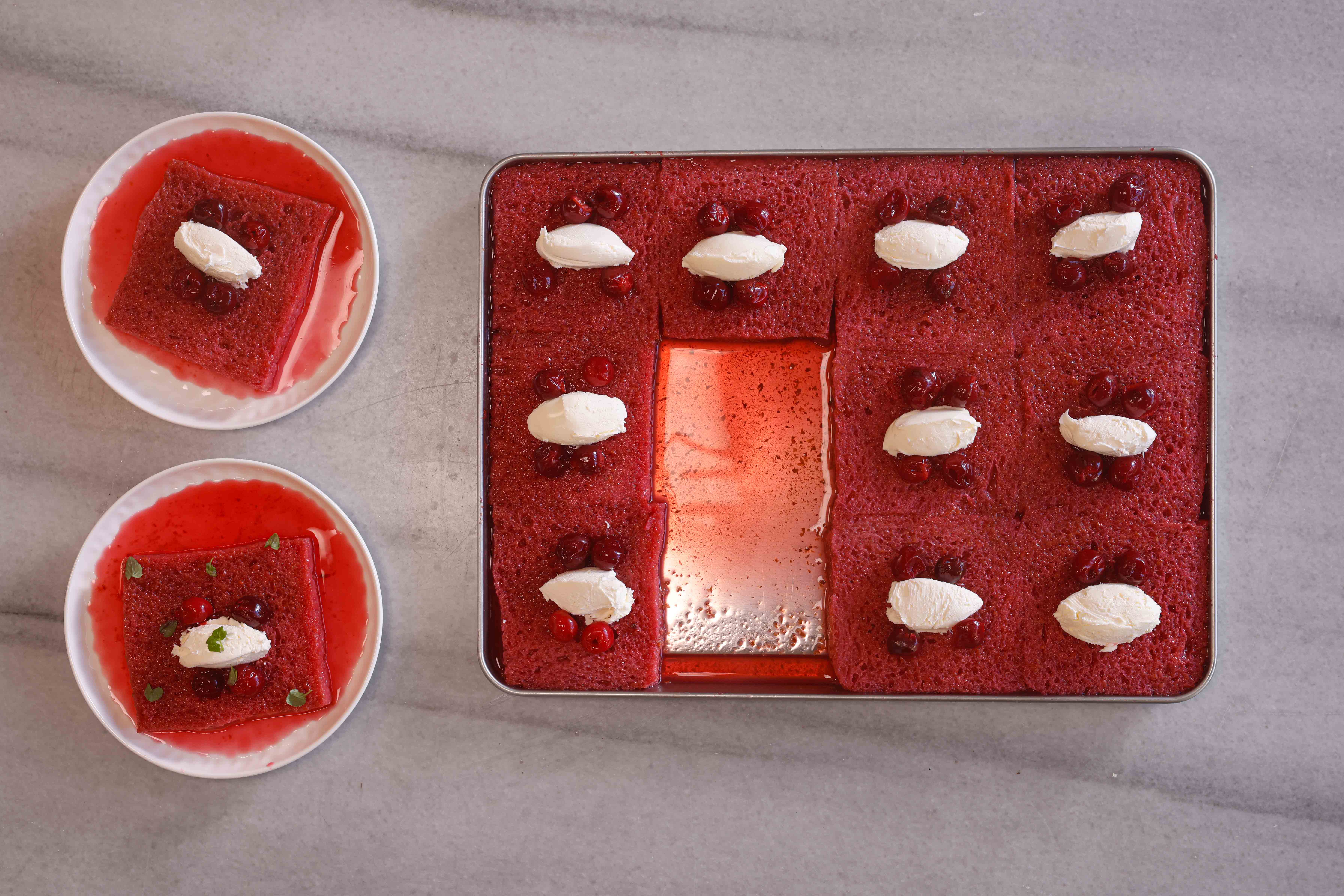 • Ayırdığınız şerbetten gezdirin. Taze nane yaprakları serpince hem hafif hem mutlu eden vişneli ekmek kadayıfınız afiyetle yemeniz için hazır.